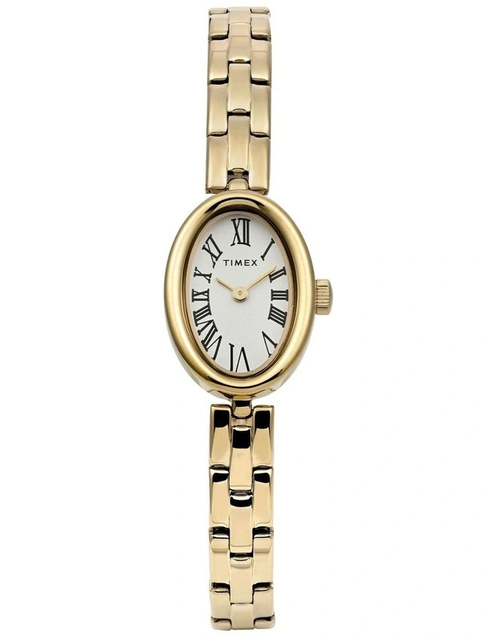 The reimagined Timex Cavatina captures vintage-inspired charm with a petite 19mm gold-tone oval case and domed crystal that mirrors the case's soft curves. Roman numerals lend timeless character to the clean white dial, while a polished gold tone recycled stainless-steel bracelet with self-adjustable links completes this classic timepiece.