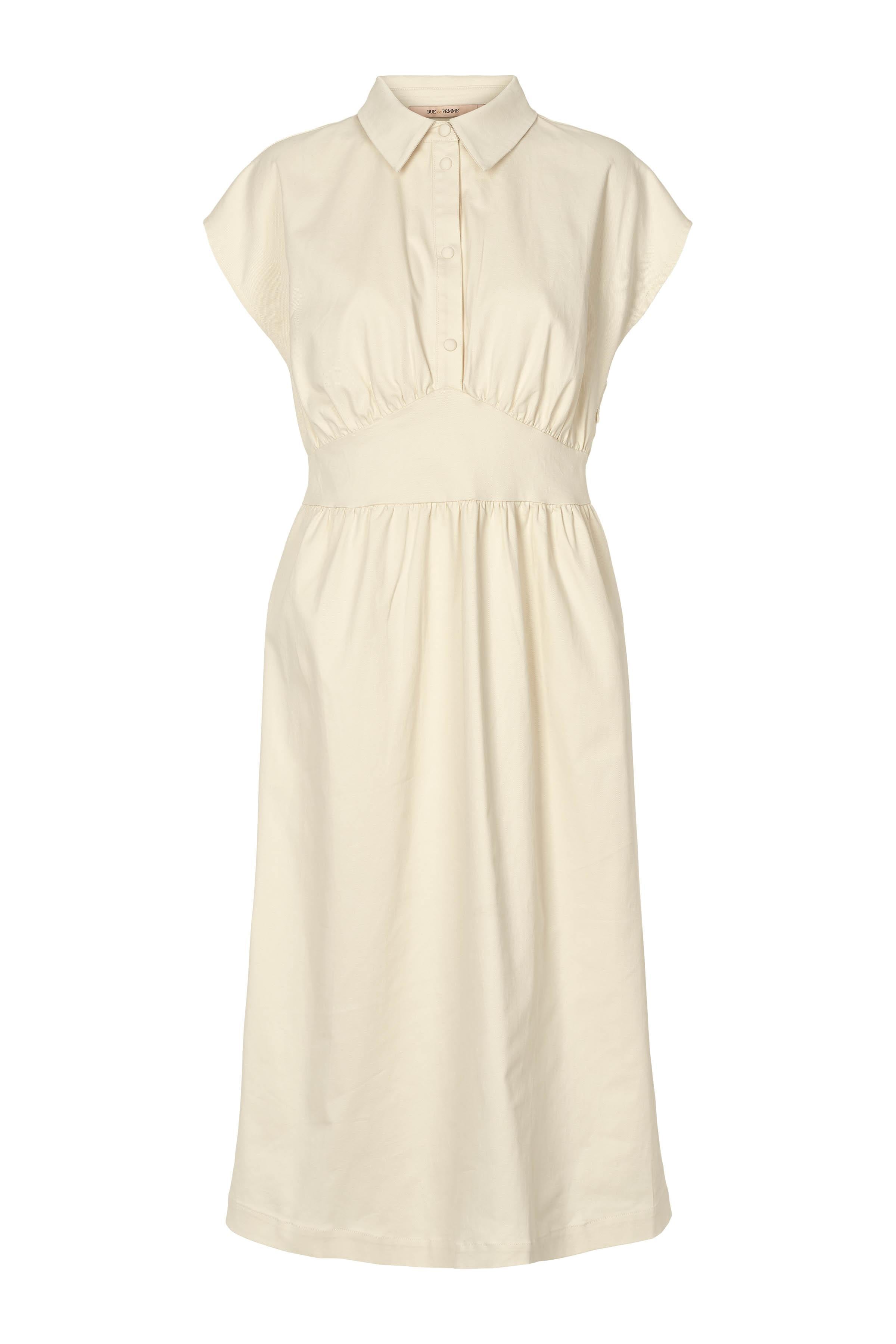 Erinia is an elegant dress with short sleeves and a defined waist that creates a feminine silhouette. The classic collar and discreet buttons at the front add a sophisticated touch to the timeless design.