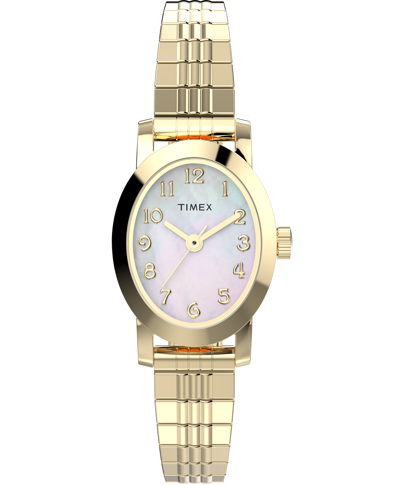 This Timex Cavatina women's watch is crafted with a polished gold-tone brass case and a lustrous stainless-steel expansion band, radiating refined elegance with every detail. The delicate oval shape frames an iridescent mother-of-pearl dial, beautifully adorned with classic Roman numeral markers for a touch of timeless sophistication. Its mineral crystal lens and 30-meter water resistance add everyday durability, while the slim profile ensures versatile comfort. A perfect fusion of style and luxury, this women's watch from Timex elevates any ensemble with its subtle brilliance, ideal for those who appreciate exquisite craftsmanship and enduring appeal in fine watches and jewelry.