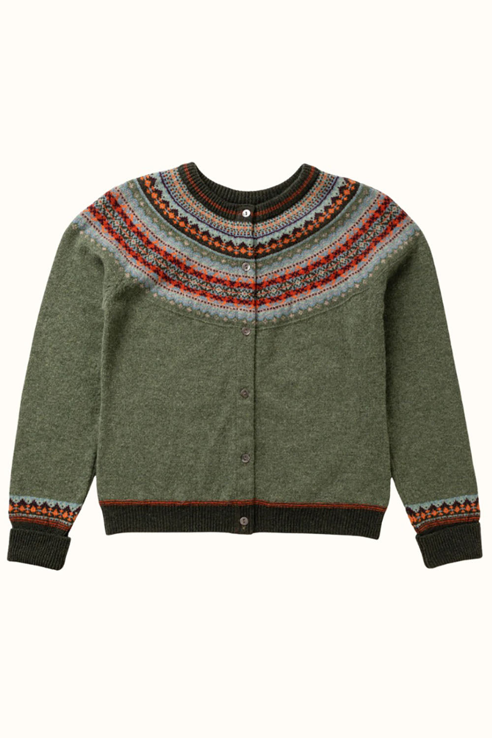 This design is a contemporary take on the Scottish fairisle yoke pattern with a small rib hem around the hip. Above the long rib cuffs is small pattern detailing mimicking a bracelet. The cardigan is front opening and lined with grosgrain ribbon to hold the mother of pearl shell buttons. The cuffs are extra-long for extra warmth or to fit longer arms.
